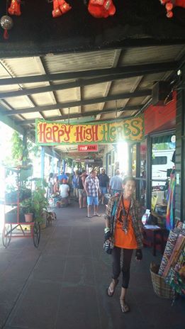 The next day we decided to go to the hippie town of Nimbin. Again we piled into Merlin’s car and started the drive into the hills (without overheating, thankfully!). The route took us through luscious hills and beautiful scenery, and was worth it in itself. Nimbin is mainly known as the place to be in Australia if you want to get high, as the police are tolerant of the use and sale of marijuana in the village. The village is thus reminiscent of Amsterdam’s marijuana-leaf filled streets, with vibrant colours and rainbow patterns everywhere. Locals sold their non-marijana related goods in the streets (after losing my earrings, I was very happy to find some silver gecko ones!), posters advertised a missing cow, and dogs were strolling the streets as if they ran the place. We only stayed for a quick lunch and look around, whilst observing the village’s many whimsical and eccentric people. Afterwards, we drove to The Channon, home to a massive market. The market was filled with art, food, music, and people, and it was amazing. We had gorgeous Thai kebabs, allowed ourselves some Dutch poffertjes (Marije and I were so happy!), and we both got henna tattoos as the boys strolled across the market. The sun was shining and all was truly, genuinely good.